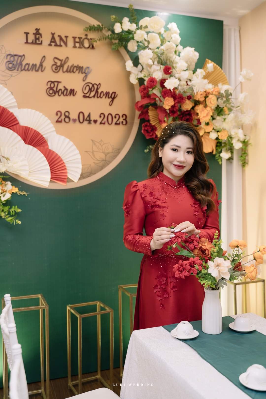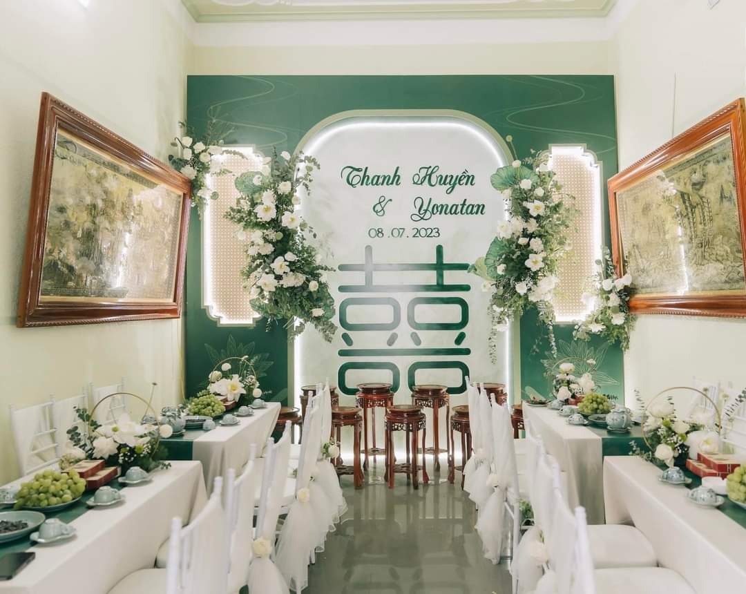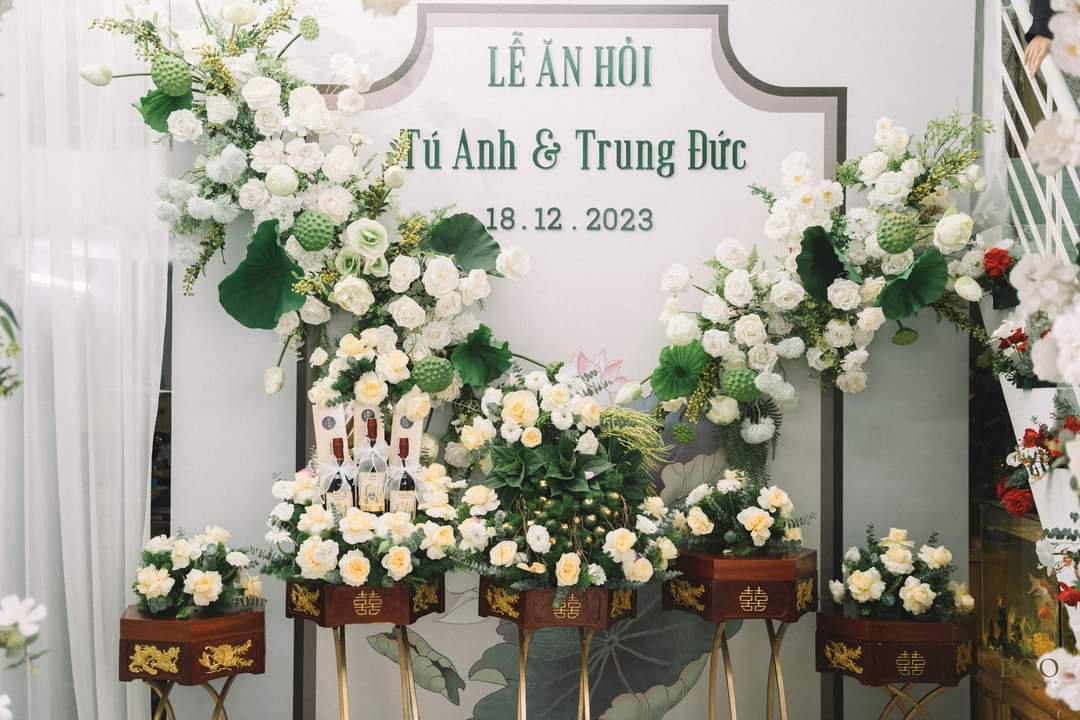 Phông kết hợp đám cưới hỏi tone xanh nổi bật giữa ngàn hoa được thực hiện tại đám cưới của chú rể Toàn Phong và cô dâu Thanh Hương, tháng 4/2023 – Long Biên HN