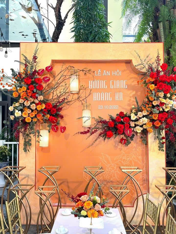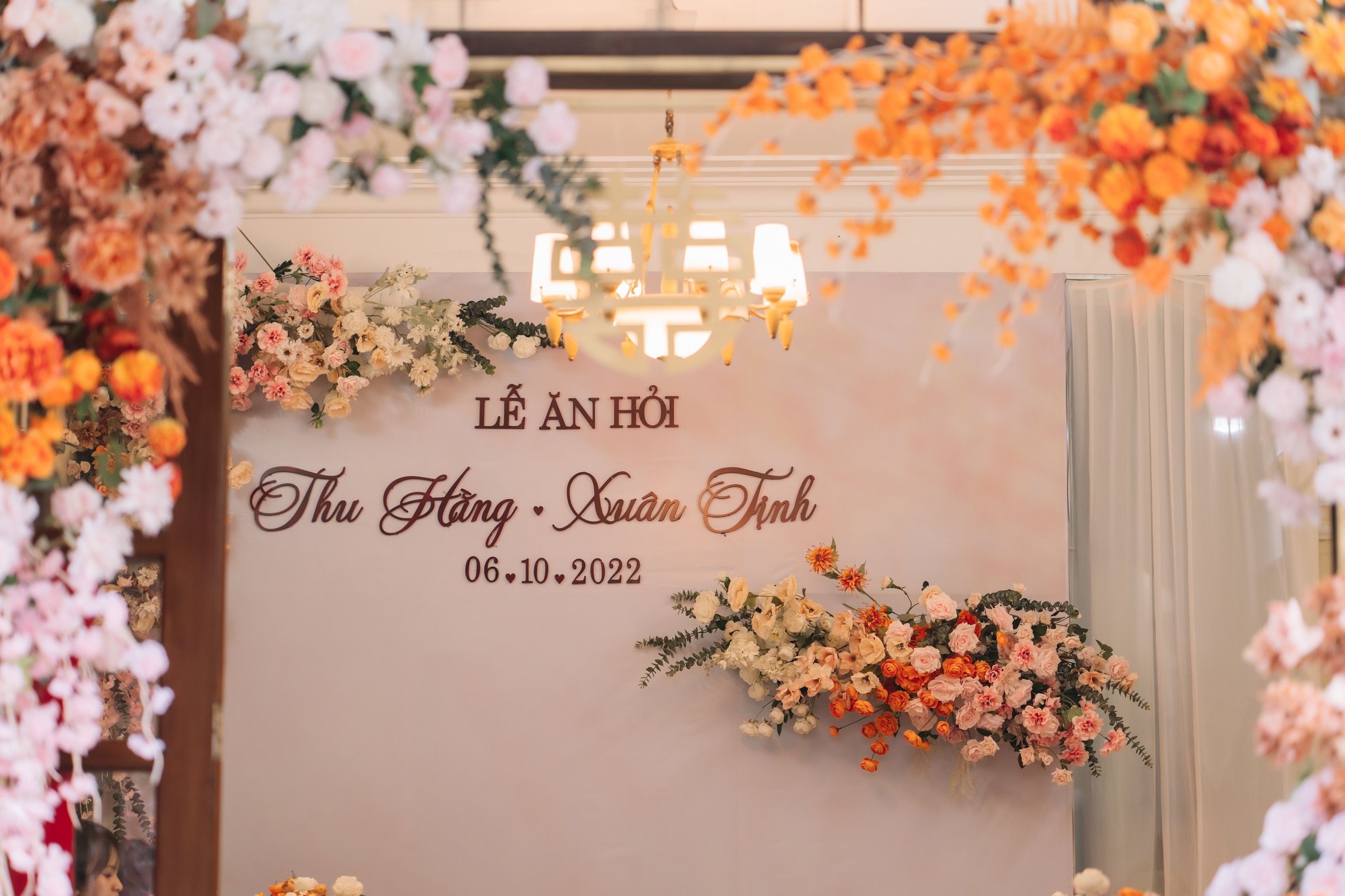 Sự khéo léo kết hợp hài hòa giữa gam màu trắng và cam kết hợp với tone đỏ làm nổi bật phông nền đám cưới