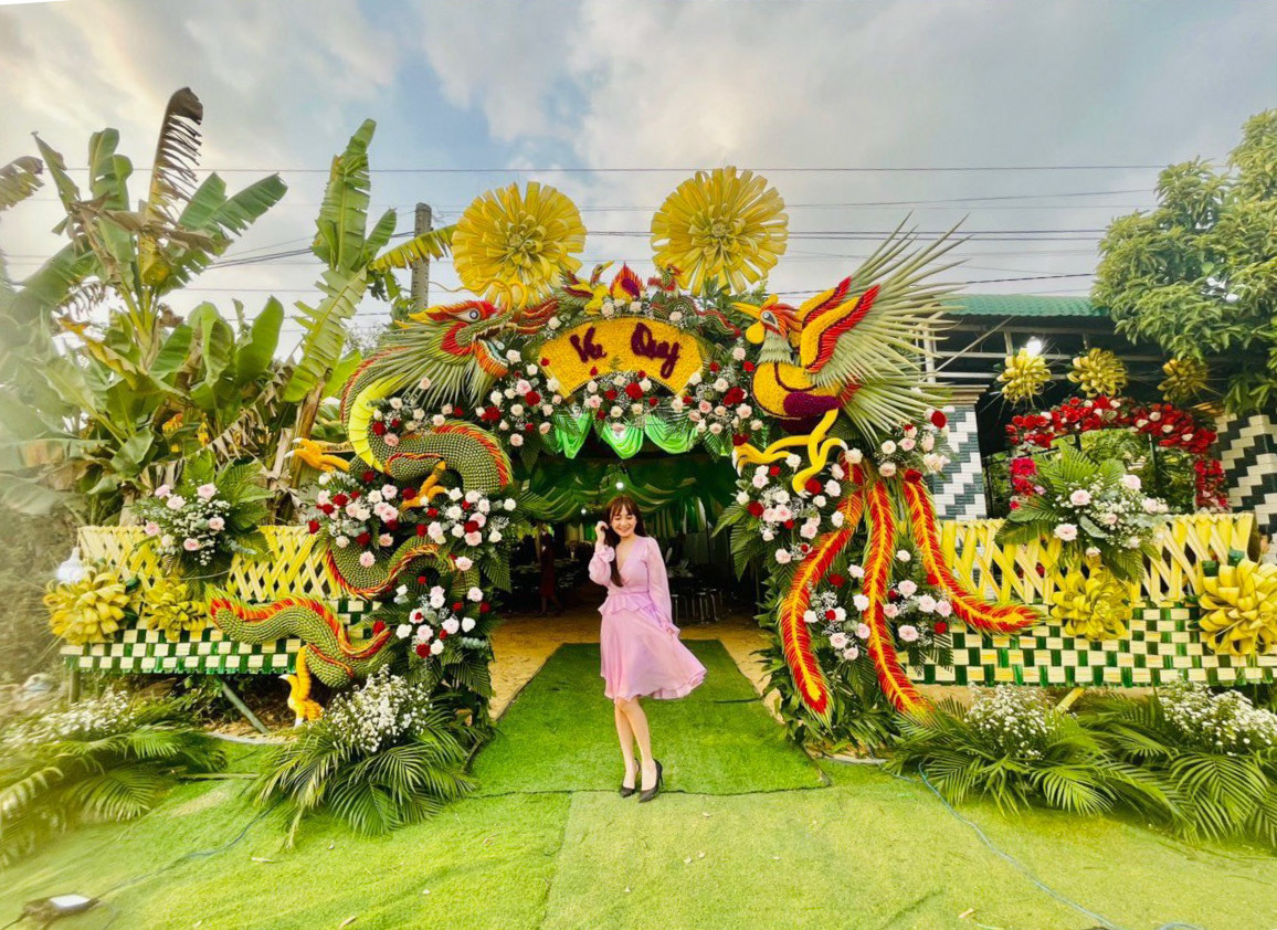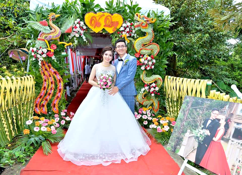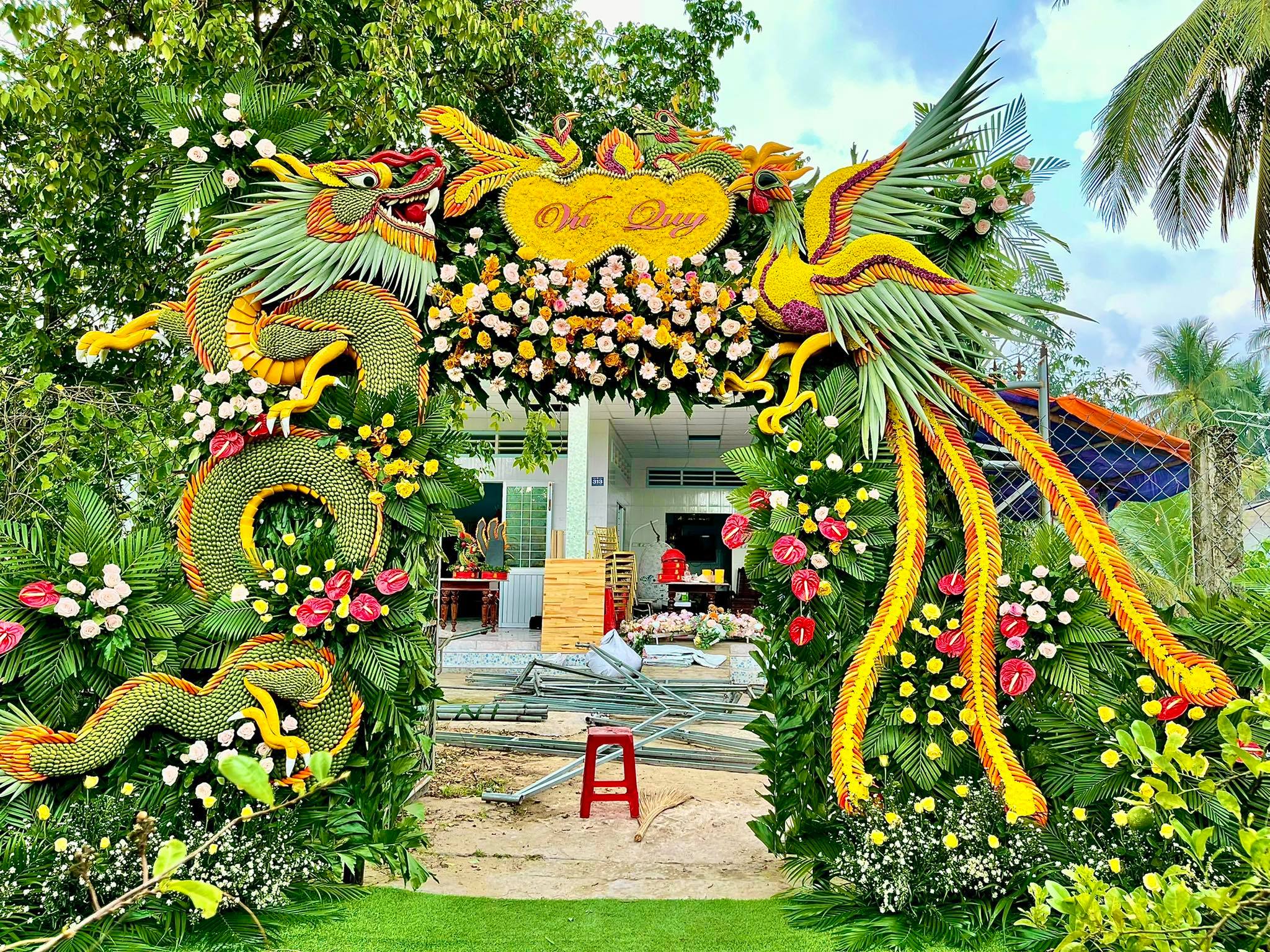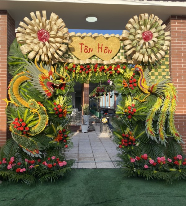 B4 : Trang trí cổng cưới : sắp xếp gắn những bông hoa và chữ Hỷ lên cổng , tiếp đó tận dụng lá dừa xanh và vàng đan xen với nhau để che đi những khoảng không bị trống . Tùy thuộc vào kiểu dáng mà bạn đã chọn để bố trí tạo hình theo . Có rất nhiều hình dáng cổng cưới cho bạn lựa chọn như Lồng đèn, hoa hay cổng cưới Rồng Phượng… Bạn cũng có thể sử dụng các phụ kiện khác để điểm xuyến cho chiếc cổng được lung linh đẹp hơn và có điểm nhấn thu hút hơn .