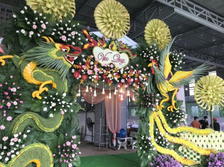 Trang trí bằng lá dứa để tạo ra những chiếc cổng cưới hình Rồng Phượng hay những khóm hoa đẹp mắt đòi hỏi sự tỉ mỉ và con mắt nghệ thuật của người thực hiện . Hãy cùng Cưới Hỏi Thu Hiền tìm hiểu về cách tạo ra một chiếc cổng cưới lá dứa này nhé