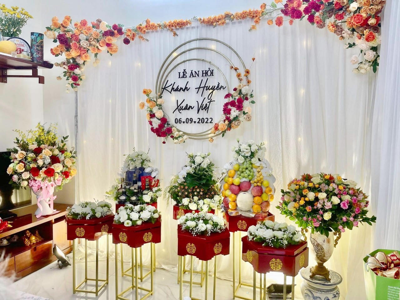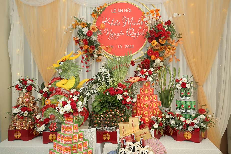 Công việc trang trí lễ ăn hỏi sẽ bao gồm các hạng mục như : trang trí bàn thờ gia tiên, trang trí background cổng hoa cưới, trang trí bàn tiếp đón khách mời