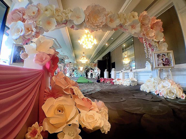 Cổng hoa đám cưới bằng hoa hồng giấy theo tone Pastel