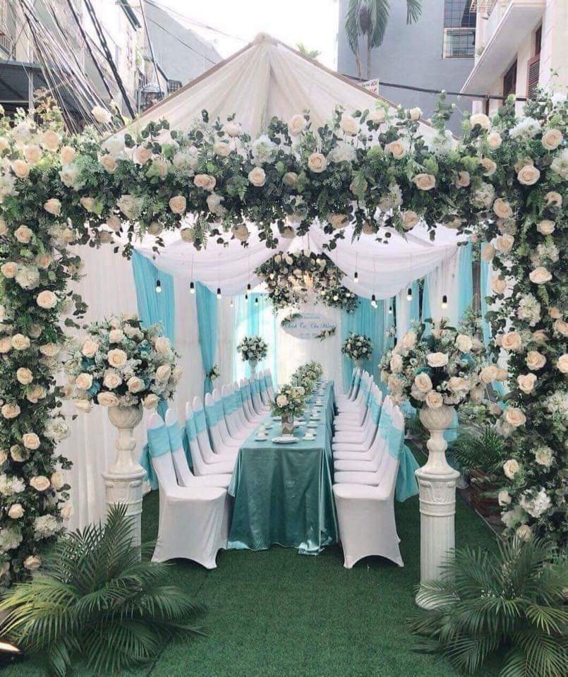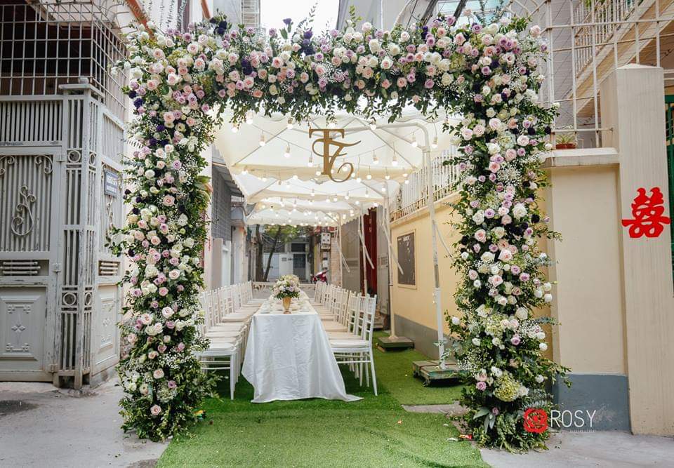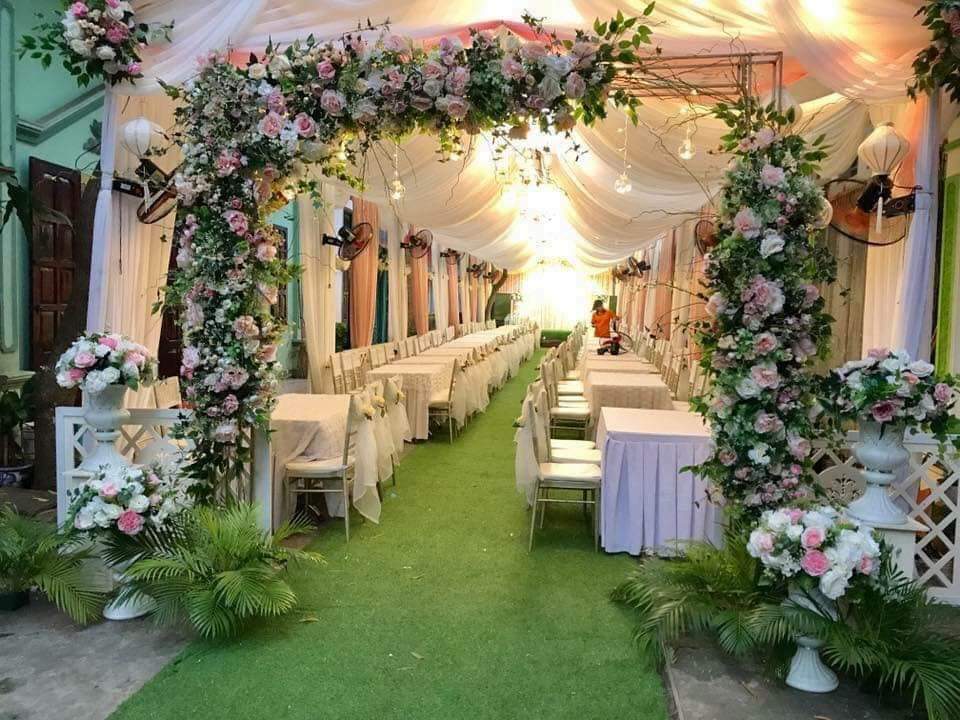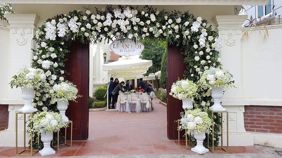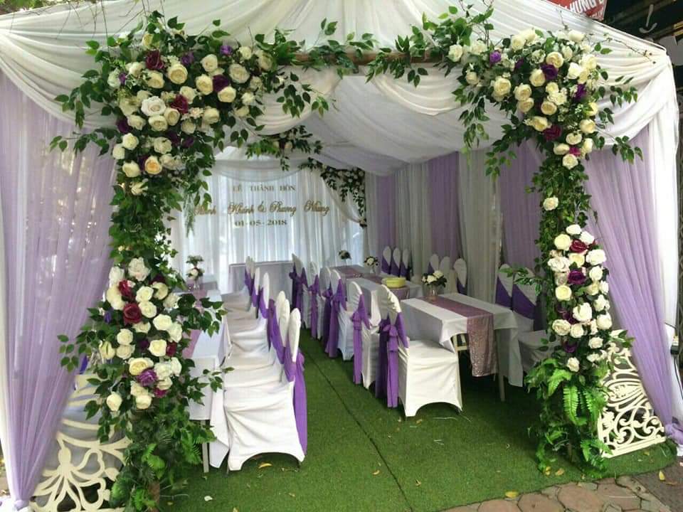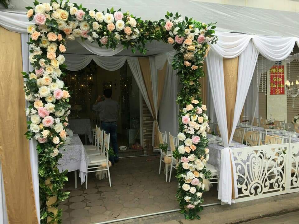 Cổng hoa đám cưới trang trí bằng hoa lụa là sự lựa chọn của đại đa phần các gia đình .