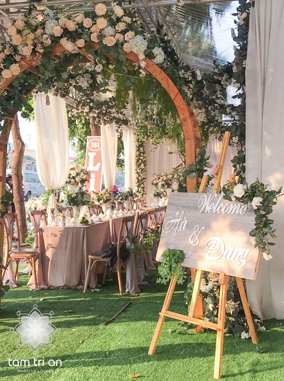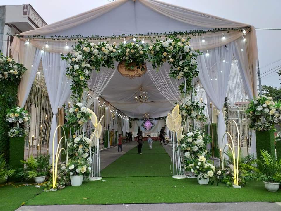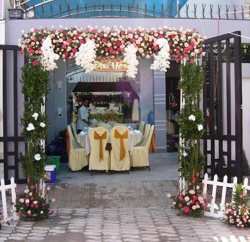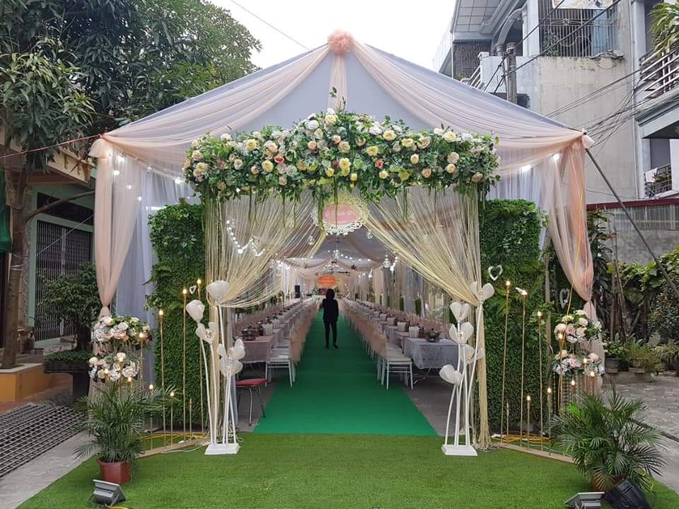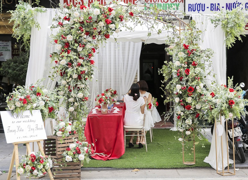Cổng hoa đám cưới trang trí bằng hoa lụa là sự lựa chọn của đại đa phần các gia đình .