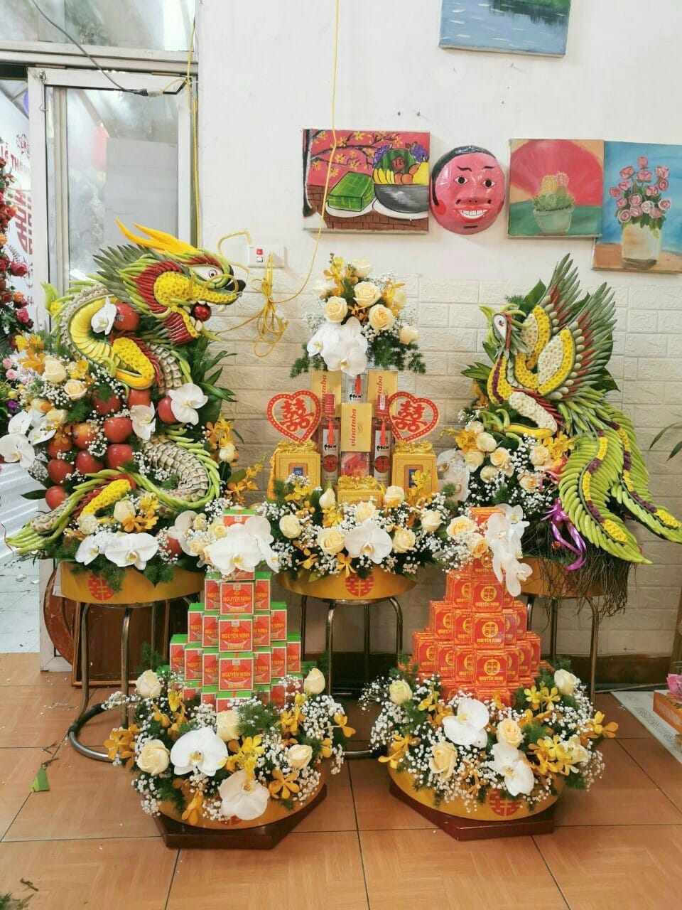 tráp trầu cau, tráp hạt sen, tráp rượu thuốc, tráp bánh phu thê , bánh cốm , tráp hoa quả…