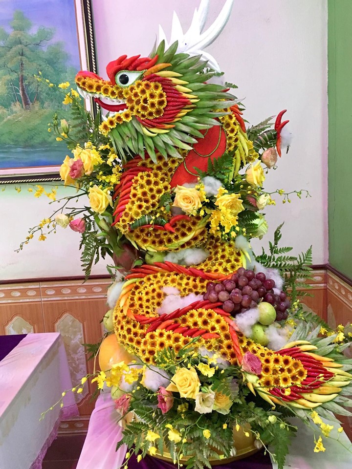 - Tráp hoa quả : dùng loại trái cây tươi để tạo nên tráp quả đẹp mắt. Có thể dùng thêm lá dứa , ớt để trang trí hình con rồng quấn quanh để đẹp mắt và hoành tráng.