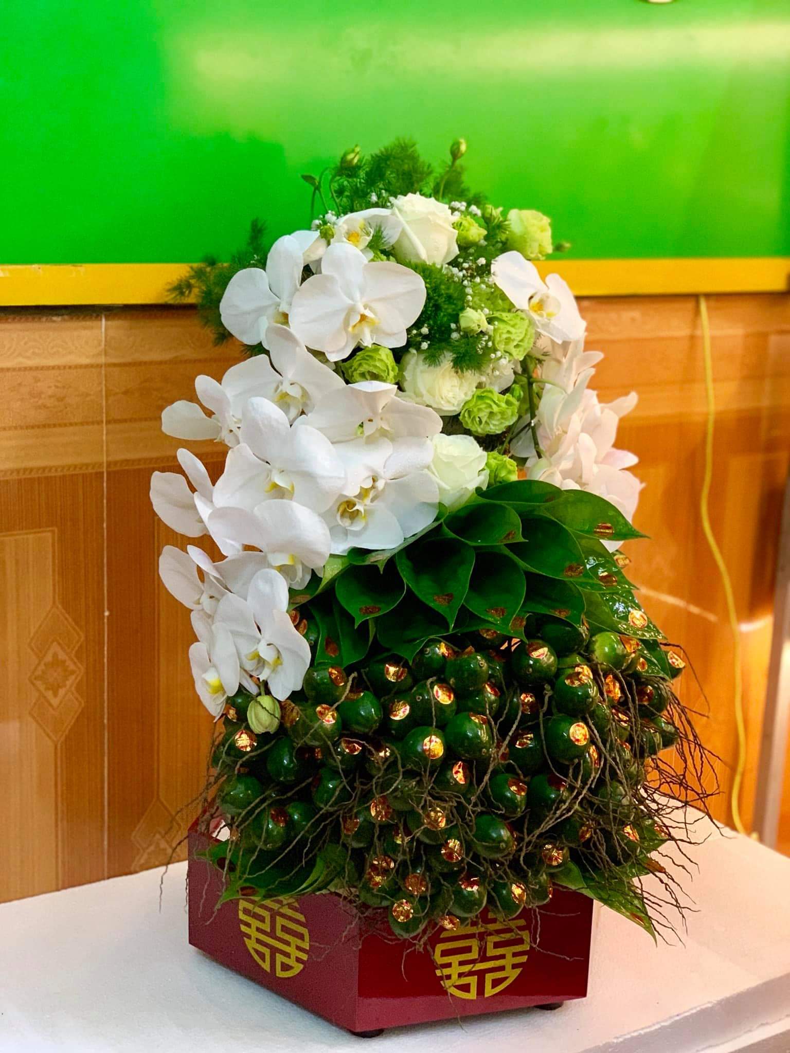 Để tráp lễ đẹp và bắt mắt hơn thì có thể kết hợp trang trí thêm bằng lá vạn tuế kết thành hình trái tim. Hoặc cầu kỳ hơn thì có thể kết tráp hình rồng phượng
