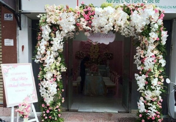 Các cặp đôi chọn những bông hoa đối xứng hai bên cửa, có cặp lại chọn đặt bóng bay hoặc chữ hỷ đỏ.
