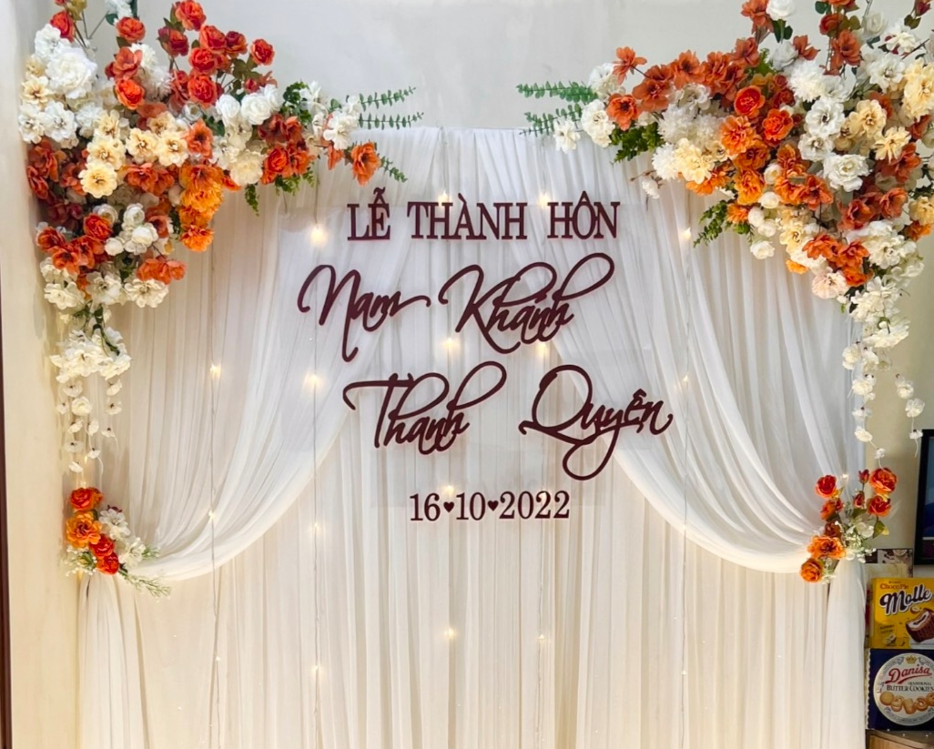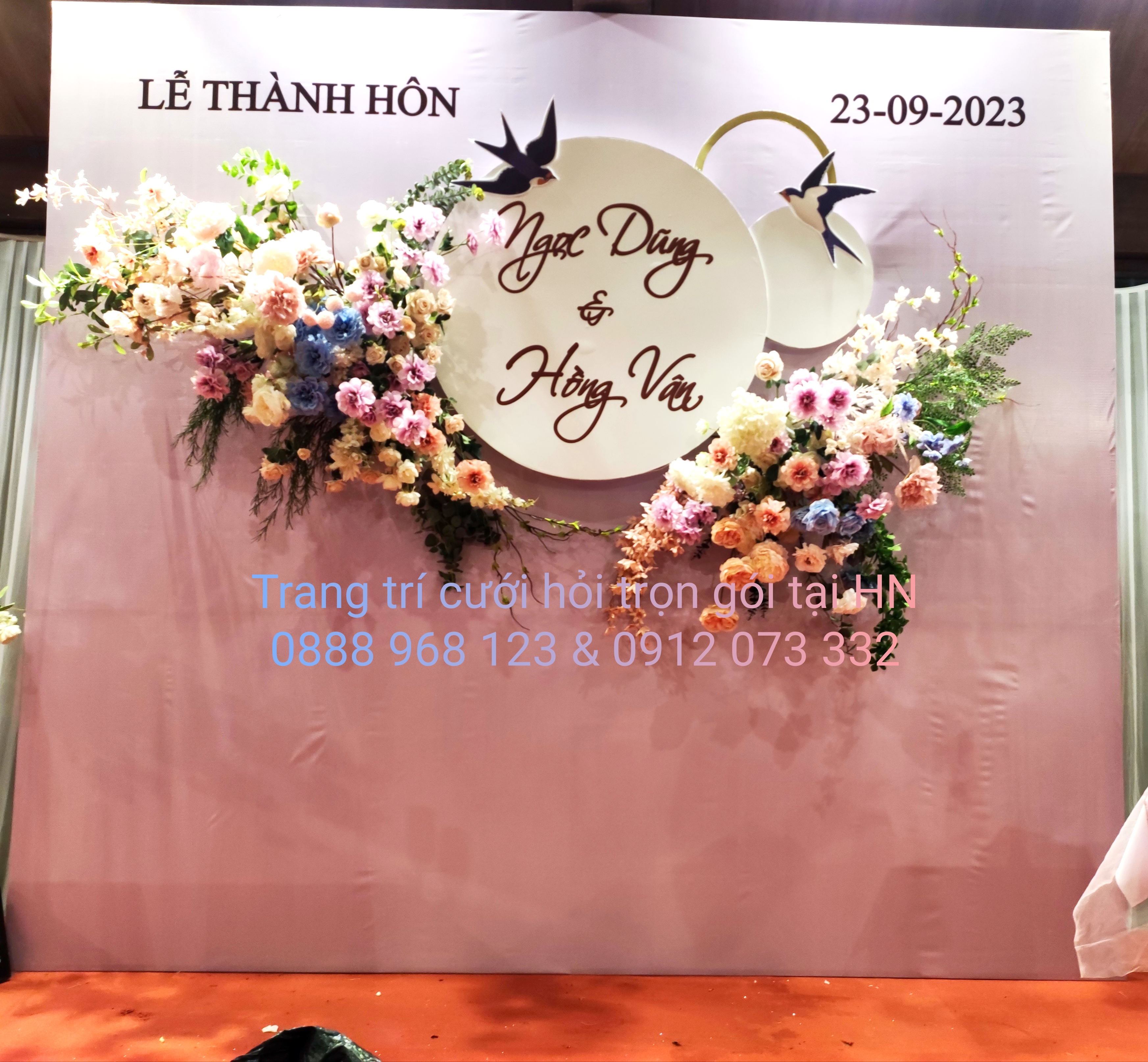Phông cưới hay còn gọi là backdrop thường được thiết kế để đặt ở trung tâm không gian tổ chức buổi lễ. Phông cưới cần chứa những thông tin cơ bản về lễ cưới hoặc lễ ăn hỏi, tên cô dâu chú rể và ngày cưới. lễ.