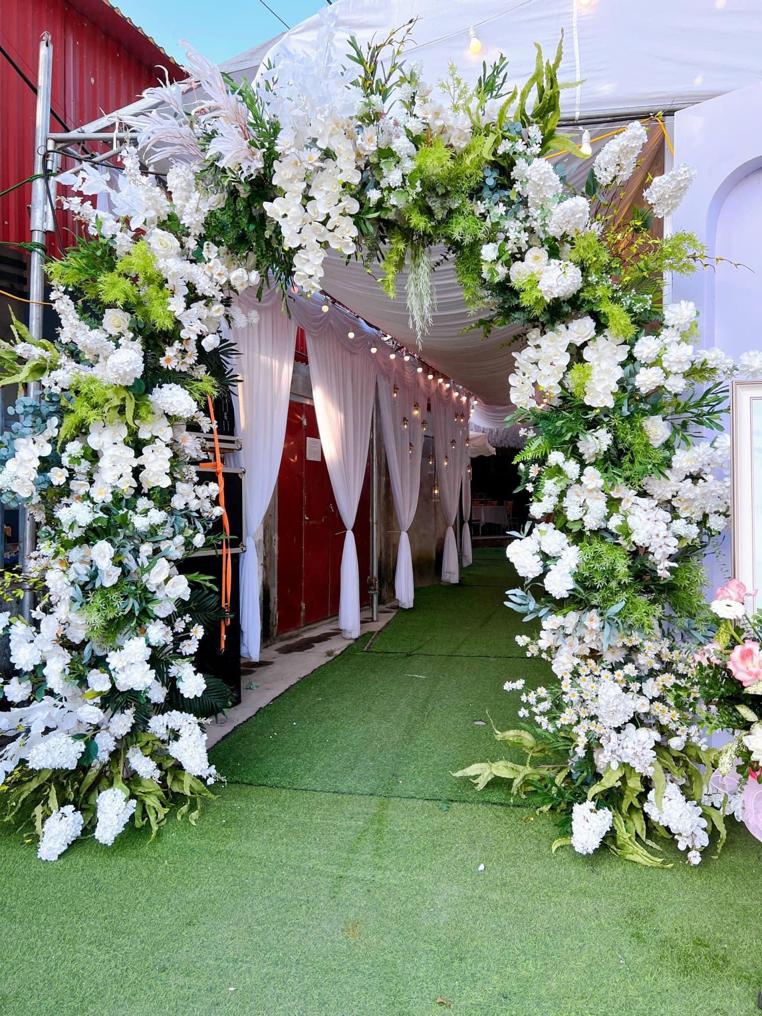 Mẫu trang trí rạp cưới thơ mộng với dây leo và sắc hoa