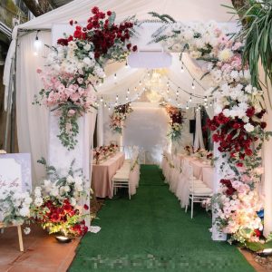 Tại sao không lựa chọn được hòa mình vào thiên nhiên lãng mạn trong đám cưới của mình? Trang trí rạp cưới bằng dây leo, cây cỏ và những bông hoa được kết nối một cách nghệ thuật. Tạo nên một không gian tươi sáng, mộng mơ đang ngày càng được nhiều cặp đôi ưa chuộng.