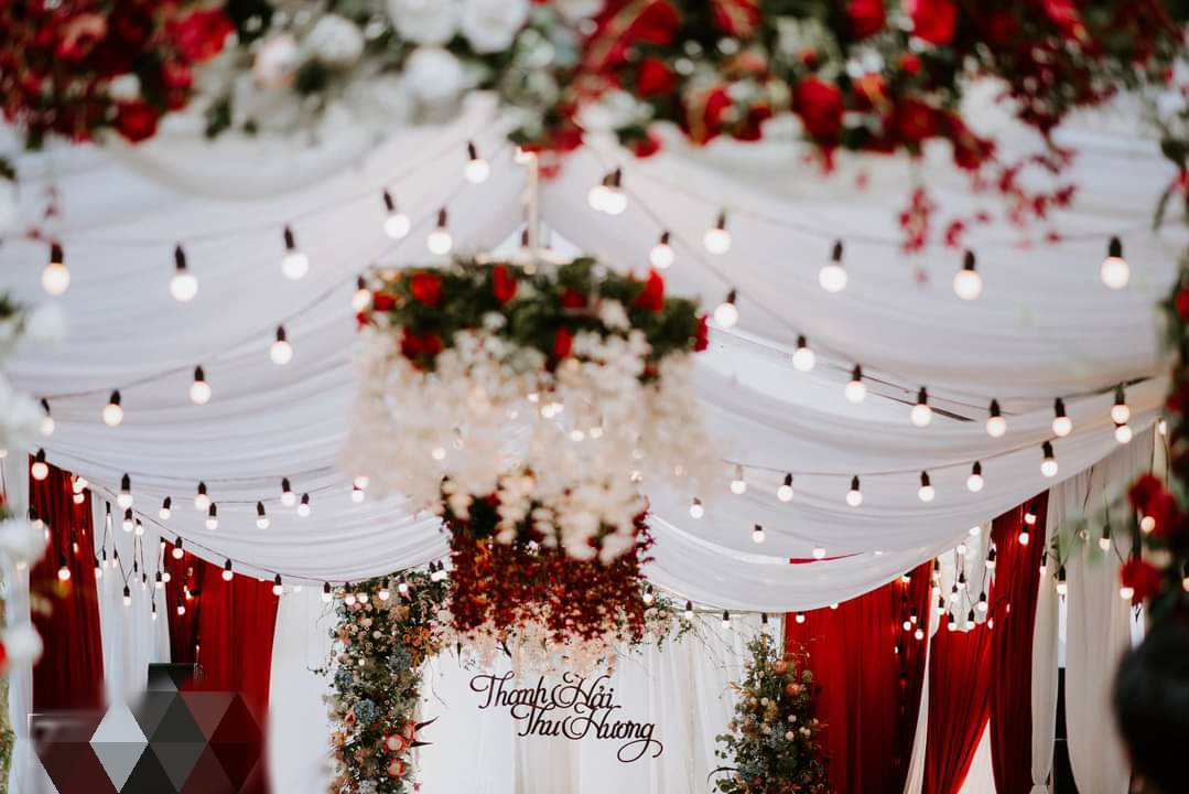 - Nhà rạp lụa tone đỏ trắng thể hiện cho tình yêu cháy bỏng mãnh liệt của đôi uyên ương