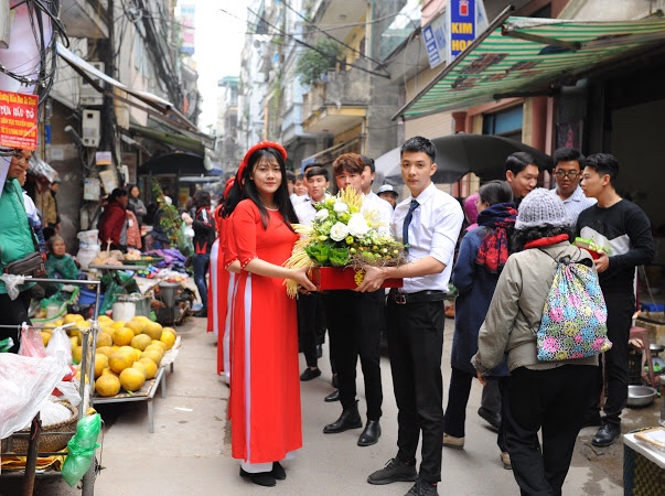 Đội hình bê đỡ tráp có mặt trong lễ ăn hỏi là một trong những phong tục cưới hỏi tốt đẹp cần được gìn giữ và lưu truyền từ hàng ngàn thế hệ sau này.