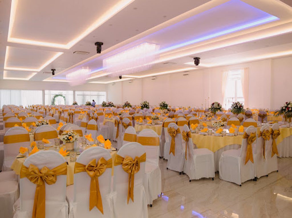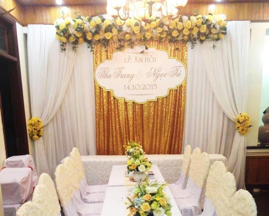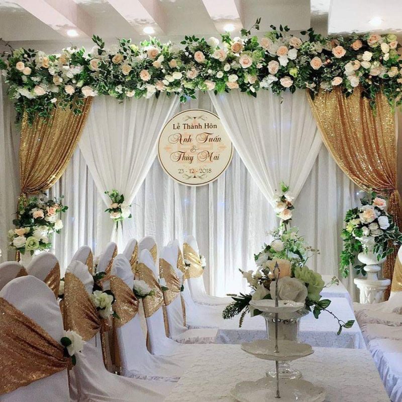 Để tạo điểm nhấn cho tiệc cưới, phông nền đám cưới kim sa, khăn trải bàn và rèm lụa phần sân khấu đều được trang trí bằng vải kim sa cùng tone màu. Tông màu tổng thể nhất quán, đảm bảo bạn sẽ có một đám cưới vô cùng nổi bật trong mắt mọi người.