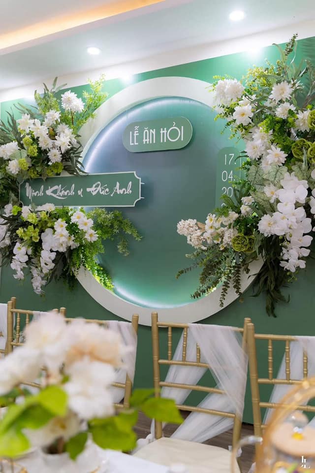 Phông cưới được trang trí kèm hoa tươi