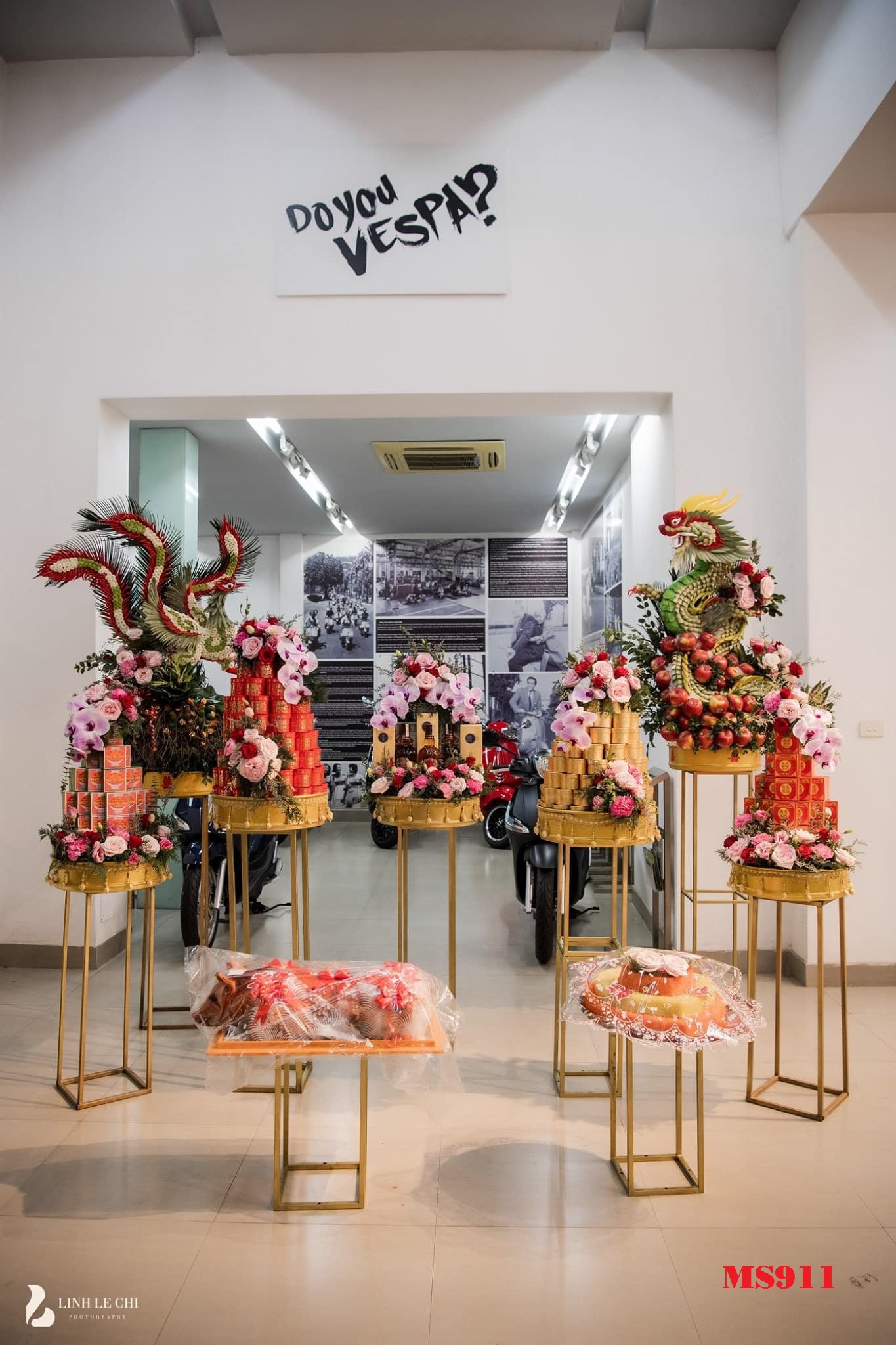 Thay vì được đặt trên mâm, lễ vật bánh cốm, bánh phu thê, bánh đậu xanh,…sẽ được khéo léo sắp xếp trên bộ tráp sơn mài cao cấp.