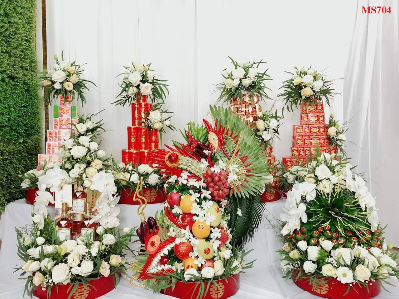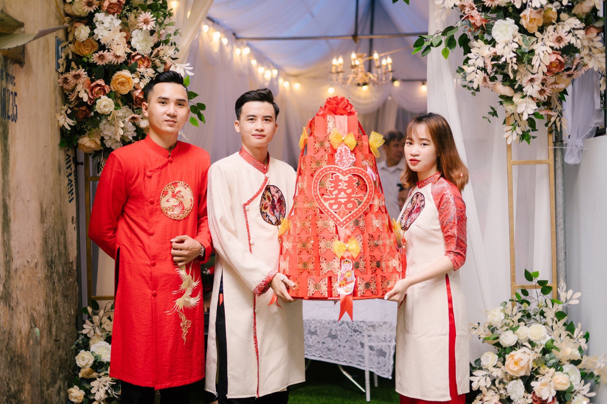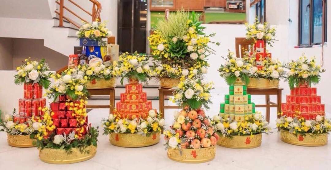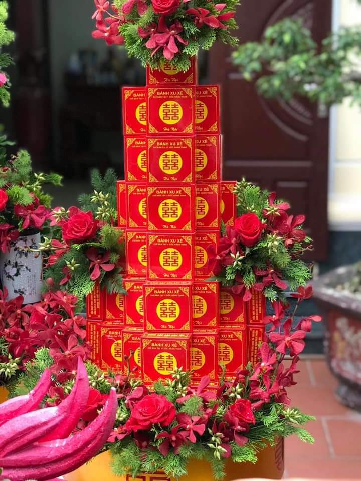 Mâm tráp bánh phu thê, bánh cốm, bánh đậu xanh được sắp xếp bắt mắt dạng hình tháp trên mâm, trang trí kết duyên sợi dây ruy băng đỏ cùng với nơ và chữ Hỷ kim tuyến