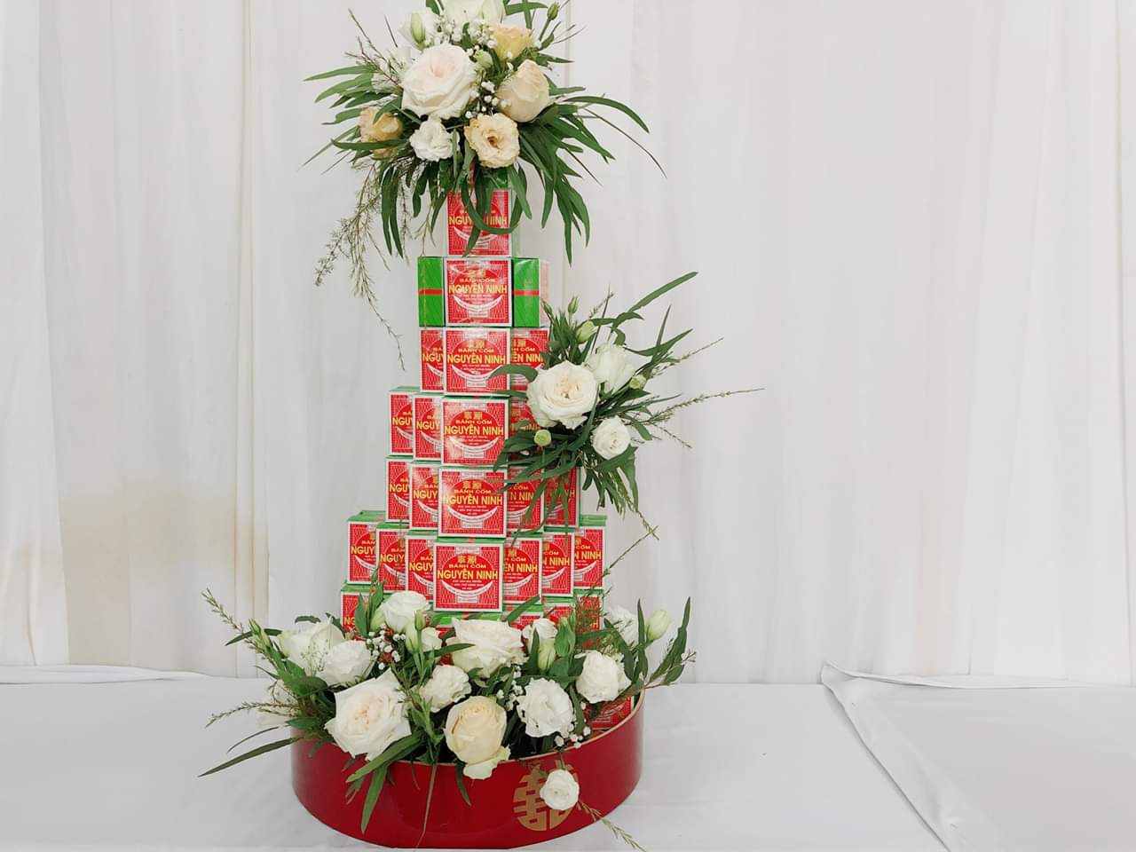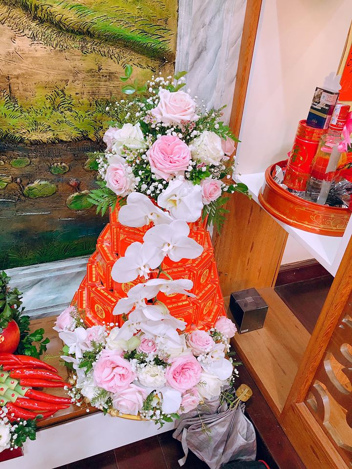 Hoặc được xếp tầng tháp giống mẫu trang trí tráp bánh truyền thống nhưng có trang trí thêm với với hoa lan trắng, hoa hồng độc đáo, đẹp mắt.
