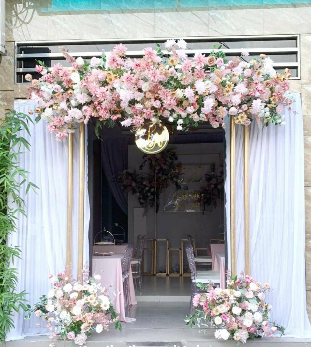Đây chính là ấn tượng đầu tiên của các quan khách trong bữa tiệc. Bạn có thể kết hợp những bông hoa màu hồng, trắng kết hợp sắc xanh của lá cây tô điểm cho chiếc cổng hoa thêm hoàn hảo.