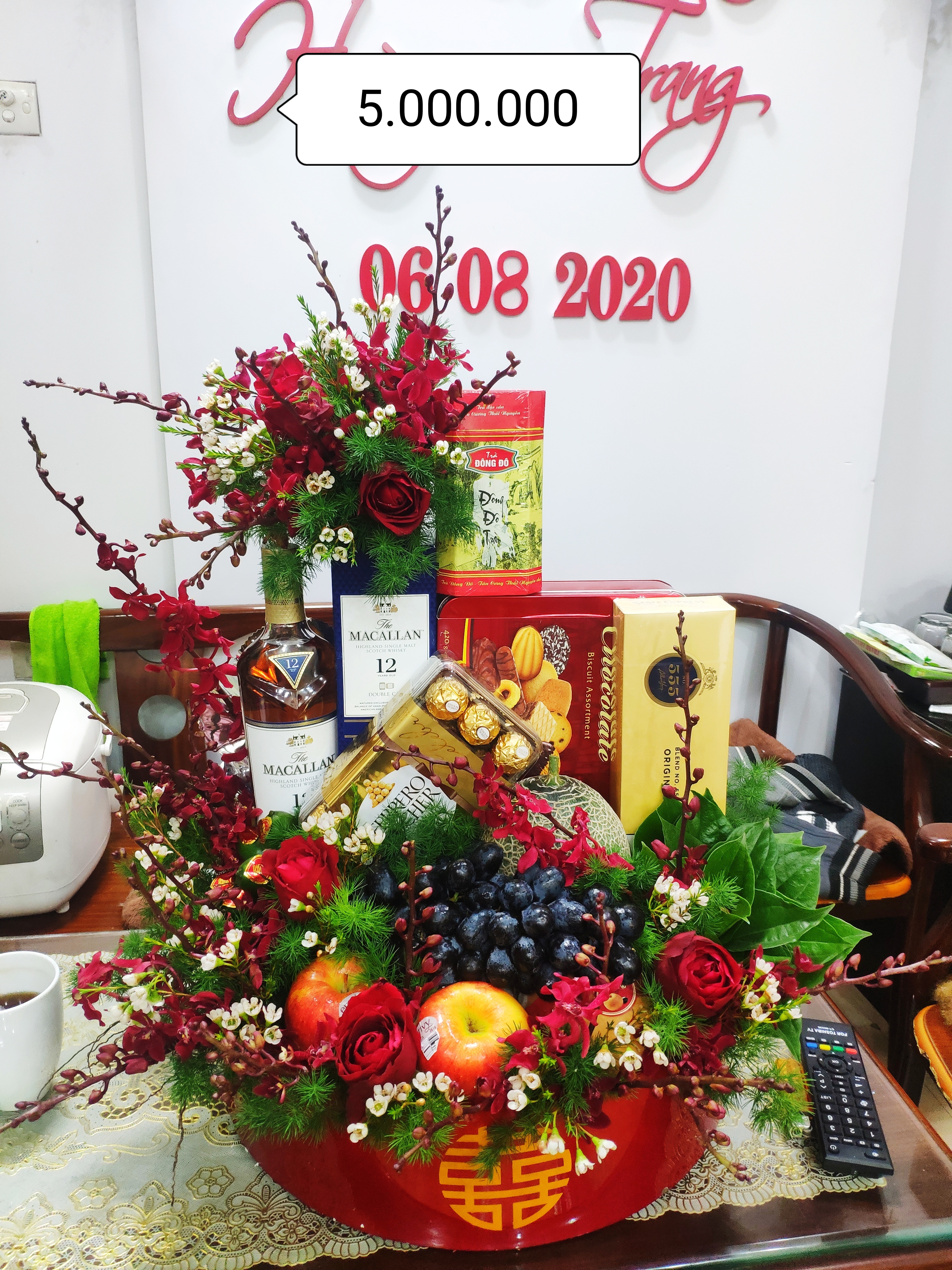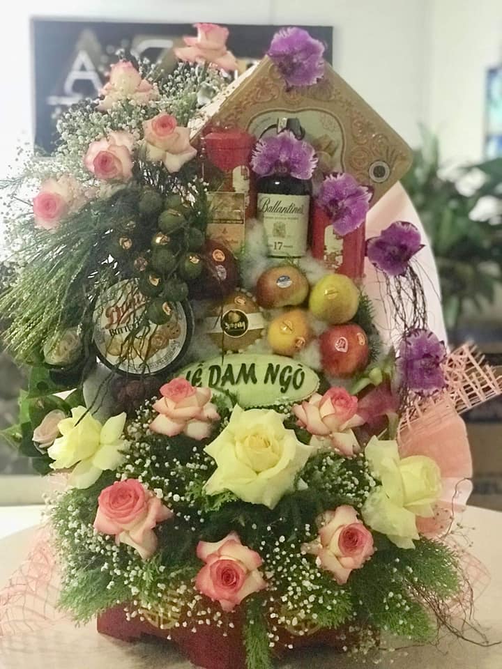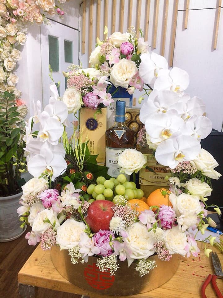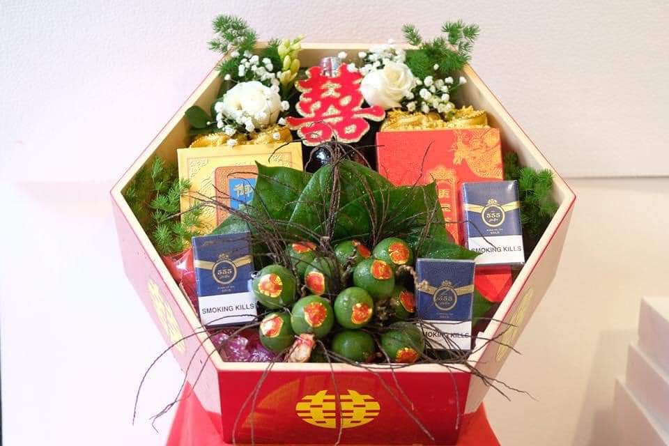 Trầu cau, trầu cau, rượu thuốc, bánh, hoa quả nhập khẩu. Giá của tráp lễ này từ 1,5 đến 6 triệu đồng.
